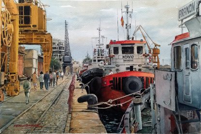 Aquarel·la pintada el 2000 del Moll de Costa, on encara hi han les velles i gegantines grúes que actualment estan en desús. El també vell remolcador Nervio ha quedat immortalitzat en aquesta pintura com en una postal antiga.