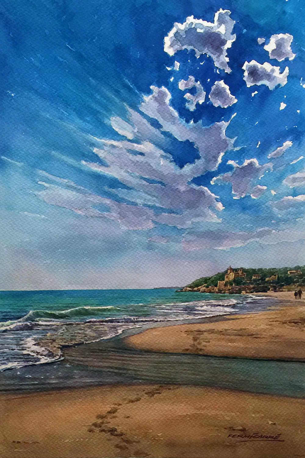 Aquarel·la de la desembocadura del riu Gaià. Un riu que pel seu poc cabal no acaba quasi mai l’arribada de l’aigua a mar. Només en comptades ocasions ho fa. Els pinzells han estat en un d’aquests moments màgics, el Castell de Tamarit n’és testimoni.