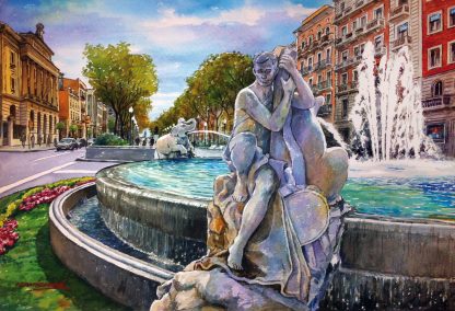 Quadre de la Font del Centenari, gran conjunt de fonts on es poden veure quatre grups escultòrics que representen ètnies dels quatre punts cardinals. Representa la celebració del centenari del despertar urbanístic de Tarragona. Està situada a un extrem de la Rambla Nova.
