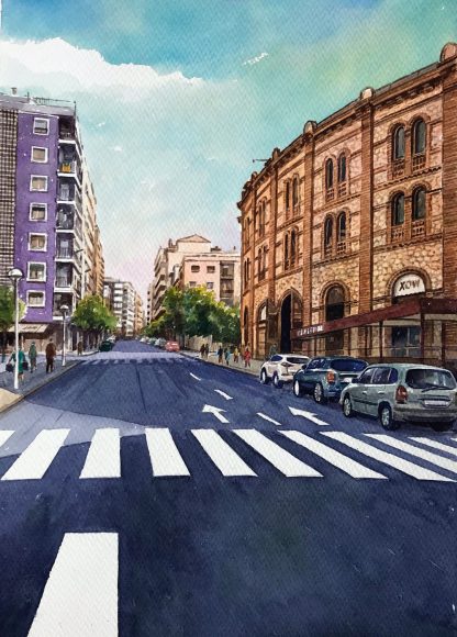 Pintura que posa en escena un enquadrament clàssic de paisatge urbà, en aquest cas el carrer Mallorca en el seu pas pel costat de la emblemàtica i antiga Plaza de Toros de Tarragona, i avui reconvertida com Tarraco Arena Plaça, un equipament urbà multifuncional d’última generació per concerts, esdeveniments, fires… la perspectiva del dibuix del carrer ens convida però, a deixar la plaça i seguir amunt.